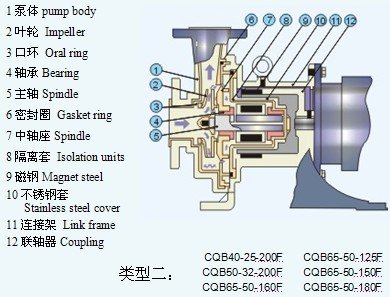 CQ型磁力驅(qū)動(dòng)泵.簡稱磁力泵,是一種通過磁力傳動(dòng)器(磁力聯(lián)軸器)來實(shí)現(xiàn)無接觸力矩傳遞從而以靜密封取代動(dòng)密封.使泵達(dá)到完全無泄漏的離心泵