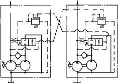 圖5為具有功率綜合的壓力傳感卸載回路,它由兩組略加變化的壓力傳感卸載泵組成,兩組泵由同一原動機(jī)驅(qū)動,每臺泵接受另一卸載泵的導(dǎo)控卸載信號。此種傳感方式稱之為交互傳感,它可使一組泵在高壓下工作而另一組泵在大流量下工作。兩只溢流閥可按每個回路特殊的壓力調(diào)整,以使一臺或兩臺泵卸載。此方案減少了功率需求,故可采用小容量價(jià)廉原動機(jī)。