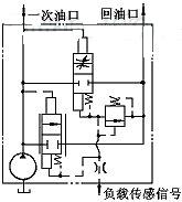 圖6所示為負(fù)載傳感卸載回路。當(dāng)主控閥的控制腔(下腔)無負(fù)載傳感信號時(shí),泵的所有流量經(jīng)閥1、閥2排回油箱;當(dāng)給此控制閥施加負(fù)載傳感信號時(shí),泵向回路供液;當(dāng)泵的輸出壓力超過負(fù)載傳感閥的壓力預(yù)定值時(shí),泵僅向回路提供工作流量,而多余流量經(jīng)閥2的節(jié)流位置旁通回油箱。