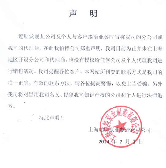近期發(fā)現(xiàn)某公司及個人與客戶接洽業(yè)務(wù)時冒稱我司的分公司或我司的代理商。在此我帕特公司鄭重聲明,我司目前為止并未在上海地區(qū)開設(shè)分公司和代理商,也沒有授權(quán)給任何公司及個人代理我司進(jìn)行銷售活動。我司提醒各位客戶,本網(wǎng)站所刊登的聯(lián)系方式是我司的唯一正確、有效的聯(lián)系方法。請各位提高警惕,以免上當(dāng)受騙。另外我司將對冒用我司名義、侵犯我司知識產(chǎn)權(quán)的公司和個人進(jìn)行法律追索。